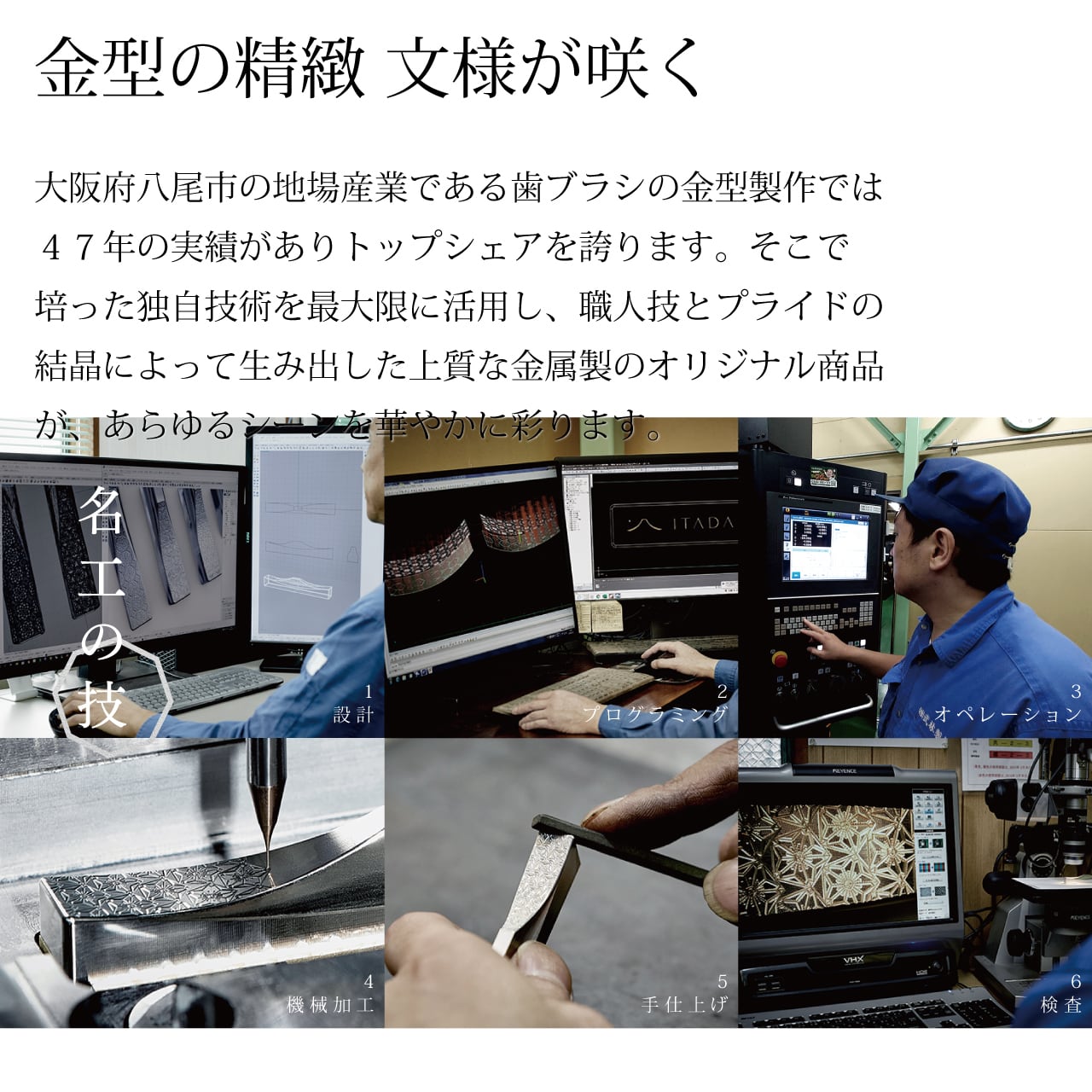 仕上げ作業においては、大阪府知事より鏡面ミガキの技術で「なにわの名工」を受賞した金型職人が、加工時にほんの僅かに発生する小傷を、微細な花の文様を崩さないように細心の注意を払いながら、より高い品質に仕上げるために一品一品丁寧に手作業で磨き上げて完成させています。